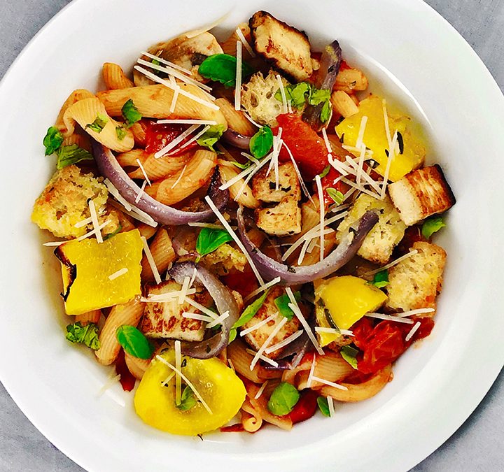 Yummy pasta tossed with pan-fried Halloumi cheese, roasted veggies, fresh rosemary, toasted ciabatta croutons, and cherry tomato mushroom sauce. Then topped off with a squeeze of fresh lemon, basil leaves, and parmesan cheese. Halloumi cheese is a semi-hard, unripened, brined cheese made from a mixture of goat and sheep milk, and has a high melting point allowing it to be sautéed long enough to develop a crispy exterior.